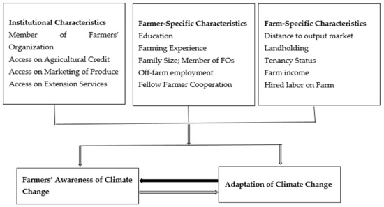Conceptually, awareness of climate change is influenced by the number of institutional, farm and farmer-specific characteristics. The institutional factors, which comprise access to agricultural credit [32], membership in farmers’ organizations (FOs) [31], access to the marketing of produce [1] and access to extension services [55], impact farmers’ CCA. Congruently, farm-specific characteristics, including distance to the output market [1], landholding [56], tenancy status [33], crop income [31] and hired labour [15], also shape the farmers’ awareness of climate change. Moreover, farmer-specific characteristics such as household size [57], farming experience [29], level of education [30], off-farm income (32, 56] and farmer-to-farmer cooperation or farmers group [55,58] influence farmers’ CCA.