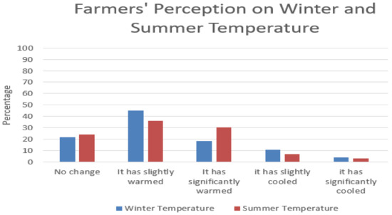 Among the respondents, 63.6% of the farmers in the study area perceived increased winter temperature. Out of these, 45.2% believed winter temperature is slightly increasing over the years, while 18.4% reported that winter temperature is significantly increasing. The rest of them were unaware of the winter temperature (36.4%). Among the unaware respondents, some farmers (21.6%) reported that there had been no change in winter temperature over the years, while 10.8% and 4% perceived slightly and significantly cooler winters, respectively.