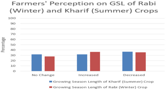 From the group of 250 interviewed farmers, 35.6% felt changes in the GSL of winter crops and 36.8% reported that the GSL of summer crops decreased, respectively, over the 10 years (Figure 5). Conversely, the majority of the sampled respondents reported either no change or increased GSL of both Rabi and Kharif crops. However, crop simulation models have revealed that the GSL of crops has reduced due to increasing temperature [61,62]. For instance, in Pakistan, the GSL of wheat, cotton and rice has reduced with severe adverse impact on wheat and rice. At the same time, there are positive and negative impacts on cotton according to its life cycle and geographic location. Further, it was found that wheat yields would be reduced by 3.4 to 12.5% in the semi-arid irrigated areas (Sheikhupura and Faisalabad) and 3.8–14% in arid (Badin, Hyderabad, Multan and Bahawalpur) areas under both A2 and B2 scenarios towards the end of 21st century [62]. Therefore, it is crucial to create climate change awareness among the farmers so that they can shift their crops to a suitable climate.