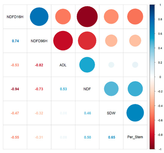 The main effects of the year (Y), location (L), genotype (G), plant maturity (M), and harvest (H) were highly significant (p < 0.001) for stem 16 h IVNDFD (Table 2), indicating that all five factors affect stem digestibility. However, among the 15 two-to-five-way interaction terms for 16 h IVNDFD, only 3 of the 15 interactions, H:G, M:G, and L:M:G, had significant interactions (p-values < 0.01). There were no significant interactions between genotype by year or between genotype by location. There were no complex interactions among the four and five factors with genotypes. The most significant interaction was among maturity, harvest, and year (p = 2.80 × 10−208), with the second-largest interaction occurring between maturity and harvest (p = 2.50 × 10−162) (Supplemental Table S2), indicating that maturity and harvest time are the most critical factors for stem digestibility. While the interaction with maturity is expected, the interaction of harvest suggests that the time of sampling is a critical factor for the selection of plants for 16 h IVNDFD. The lack of interaction of genotype with location and year indicates the environmental stability of selected traits and will be addressed more fully later. Across locations, harvests, and maturities, stem 16 h IVNDFD was strongly negatively correlated with NDF (−0.94) (Figure 1).