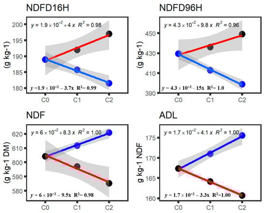 Responses in IVNDFD and CW components over two cycles of divergent selection. Populations selected for high 16 h and high 96 h IVNDFD are in red, and populations selected for low 16 h IVNDFD and low 96 h IVNDFD are in blue. Gray shading around the regression line is the 95% confidence interval around the mean across years, locations, harvests, and maturities. Regression equations and R2 over the two cycles are shown above or below each line.