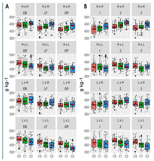 Effect of maturity and harvest on 96 h IVNDFD in selected populations. (A) Ninety-six h IVNDFD at early bud (EB), late flower (LF), and green pod (GP) maturity stages across two years, two locations, and three harvests. (B) Ninety-six h IVNDFD for combined maturity stages at Harvest 1, 2, and 3 across two years, two locations, and three maturities. The small dots are the individual values, and the large black dots are outliers. The red diamond inside each box is the mean value. C0, unselected population; C1, cycle 1 population; C2, cycle 2 population; H × H, intermating of plants with high 16 h IVDFD and high 96 h IVNDFD; L × L, intermating of plants with low 16 h IVDFD and low 96 h IVNDFD.