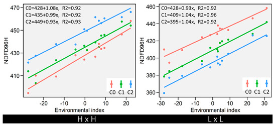 Complex genotype × environment interactions for forage quality traits in alfalfa present a challenge to breeders in analyzing germplasm performance. Stem IVNDFD, ADL/NDF, and NDF were shown in this experiment and previous experiments [10] to be impacted by the environment. Environmental stability was measured for each of these traits across the 12 harvest environments for the H16 × H96 and L16 × L96 populations. Stability coefficients for 96 h IVNDFD decreased with selection cycles from 1.08 (C0) to 0.93 (C2) for the H × H populations (Figure 4). In contrast, stability coefficients increased in the L16 × L96 populations with selection cycles from 0.93 to 1.04 and from C0 to C2, respectively. The stability of 16 h IVNDFD followed similar patterns (Supplemental Figure S1). A stability coefficient of b > 1 indicates that the response of the population was better than the average response in favorable environments, while b < 1 suggests that the population performed better than average in unfavorable environments. Therefore, for 96 h IVNDFD, the C2 H16 × H96 population performed better in the less favorable environments, and the C2 L16 × L96 population performed better than average in the favorable environments. Overall, 16 h and 96 h IVNDFD were considered to be environmentally stable in H × H and L × L populations.