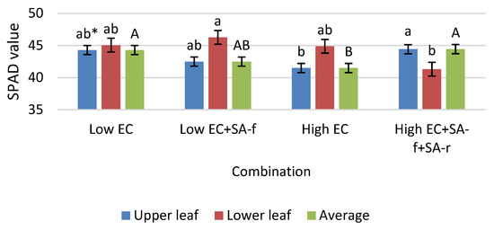 Effect of high EC nutrient solution and SA treatment in aeroponic cultivation on SPAD index in pepper leaves (average of two terms ± SE). * Mean values marked with the same letters do not differ significantly according to the Tukey HSD test at α = 0.05. Lowercase letters indicate differences in the interaction of leaves × treatment, capital letters indicate differences between treatments (mean of two terms).