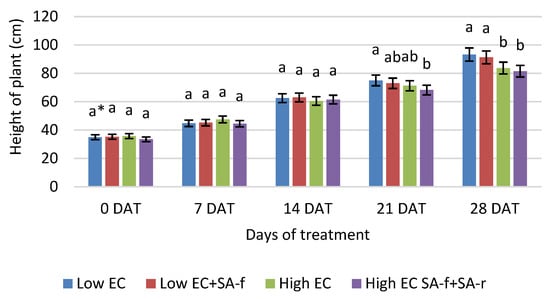 Effect of high EC nutrient solution and SA treatment in aeroponic cultivation on the height of plant in the following days after treating (DAT) pepper plant with high EC (average of two terms ± SE). * Means with different letters indicate a statistically significant difference according to the Tukey HSD test at α = 0.05.