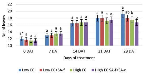 Effect of high EC nutrient solution and SA treatment in aeroponic cultivation on the number of leaves in the following days after treating (DAT) pepper plant with high EC (average of two terms ± SE). * Means with different letters indicate a statistically significant difference according to the Tukey HSD test at α = 0.05.