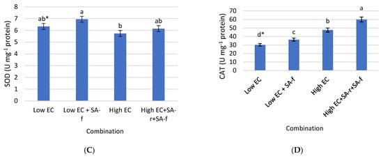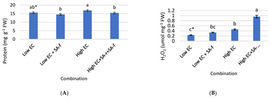 In order to precisely investigate the redox homeostasis in pepper leaves in response to different treatment combinations, the H2O2 content and activity of antioxidant enzymes: SOD and CAT were determined. In the first step, the soluble protein level was analysed and it was observed that it had a higher value when EC increased. The simultaneous treatment with SA to both low and high-EC-treated plants negatively influenced protein content. The foliar application of SA to the plants cultivated under low EC reduced protein level up to 14.58 mg g−1 FW (Figure 4A).