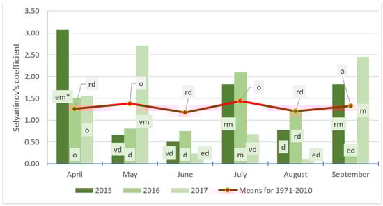 Selyaninov’s coefficient during the growing period as compared to the long-term means (1971–2010). * Interpretation of the value of the Sielianinov coefficient according to [40]: ed—extremely dry, vd—very dry, d—dry, rd—rather dry, o—optimal, rm—rather moist; m—moist, vm—very moist, em—extremely moist.