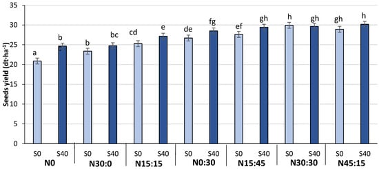 Effects of nitrogen × sulphur application on the yield of soybean seeds. Means marked with the same letter do not differ significantly at p = 0.05, bars mean SE. S0—without sulfur, S40—40 kg S ha−1, N0—without nitrogen, N30:0—30 kg N ha−1 before sowing, N15:15—15 kg N ha−1 before sowing + 15 kg N ha−1 at the start of the seed filling, N:0:30—30 kg N ha−1 at the start of the seed filling, N15:45—15 kg N ha−1 before sowing + 30 kg N ha−1 at the start of the seed filling, N30:30—30 kg N ha−1 before sowing + 30 kg N ha−1 at the start of the seed filling, N45:15—45 kg N ha−1 before sowing + 15 kg N ha−1 at the start of the seed filling.
