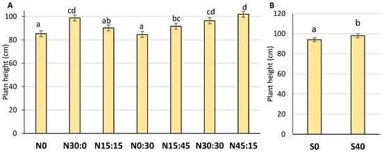 Effects of nitrogen (A), sulphur (B) application on the height of soybean plants. Means marked with the same letter do not differ significantly at p = 0.05, bars mean SE. S0—without sulfur, S40—40 kg S ha−1, N0—without nitrogen, N30:0—30 kg N ha−1 before sowing, N15:15—15 kg N ha−1 before sowing + 15 kg N ha−1 at the start of the seed filling, N:0:30—30 kg N ha−1 at the start of the seed filling, N15:45—15 kg N ha−1 before sowing + 30 kg N ha−1 at the start of the seed filling, N30:30—30 kg N ha−1 before sowing + 30 kg N ha−1 at the start of the seed filling, N45:15—45 kg N ha−1 before sowing + 15 kg N ha−1 at the start of the seed filling.