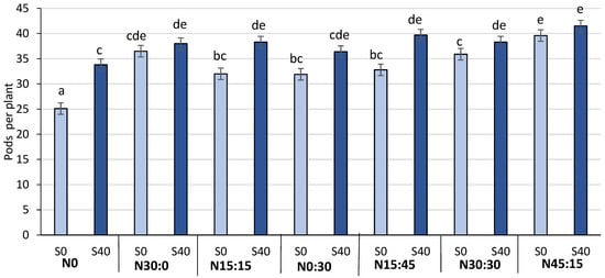 Effects of nitrogen × sulphur application on the number of pods per plant. Means marked with the same letter do not differ significantly at p = 0.05, bars mean SE. S0—without sulfur, S40–40 kg S ha−1, N0—without nitrogen, N30:0—30 kg N ha−1 before sowing, N15:15—15 kg N ha−1 before sowing + 15 kg N ha−1 at the start of the seed filling, N:0:30—30 kg N ha−1 at the start of the seed filling, N15:45—15 kg N ha−1 before sowing + 30 kg N ha−1 at the start of the seed filling, N30:30—30 kg N ha−1 before sowing + 30 kg N ha−1 at the start of the seed filling, N45:15—45 kg N ha−1 before sowing + 15 kg N ha−1 at the start of the seed filling.