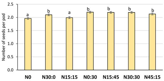 Effects of nitrogen application on the seed number per pod. Means marked with the same letter do not differ significantly at p = 0.05, bars mean SE N0—without nitrogen, N30:0—30 kg N ha−1 before sowing, N15:15—15 kg N ha−1 before sowing + 15 kg N ha−1 at the start of the seed filling, N:0:30—30 kg N ha−1 at the start of the seed filling, N15:45—15 kg N ha−1 before sowing +30 kg N ha−1 at the start of the seed filling, N30:30—30 kg N ha−1 before sowing + 30 kg N ha−1 at the start of the seed filling, N45:15—45 kg N ha−1 before sowing + 15 kg N ha−1 at the start of the seed filling.