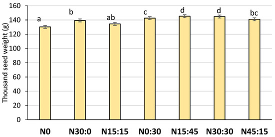 Effects of nitrogen application on the thousand seed weight. Means marked with the same letter do not differ significantly at p = 0.05, bars mean SE. N0—without nitrogen, N30:0—30 kg N ha−1 before sowing, N15:15–15 kg N ha−1 before sowing + 15 kg N ha−1 at the start of the seed filling, N:0:30–30 kg N ha−1 at the start of the seed filling, N15:45—15 kg N ha−1 before sowing + 30 kg N ha−1 at the start of the seed filling, N30:30—30 kg N ha−1 before sowing +30 kg N ha−1 at the start of the seed filling, N45:15—45 kg N ha−1 before sowing + 15 kg N ha−1 at the start of the seed filling.