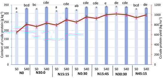 Effects of nitrogen × sulphur application on the content of crude protein in soybean seeds and protein yield. Means marked with the same letter do not differ significantly at p = 0.05, bars mean SE, red line–protein yield. S0–without sulfur, S40—40 kg S ha−1, N0–without nitrogen, N30:0—30 kg N ha−1 before sowing, N15:15—15 kg N ha−1 before sowing + 15 kg N ha−1 at the start of the seed filling, N:0:30—30 kg N ha−1 at the start of the seed filling, N15:45—15 kg N ha−1 before sowing + 30 kg N ha−1 at the start of the seed filling, N30:30—30 kg N ha−1 before sowing + 30 kg N ha−1 at the start of the seed filling, N45:15—45 kg N ha−1 before sowing + 15 kg N ha−1 at the start of the seed filling.