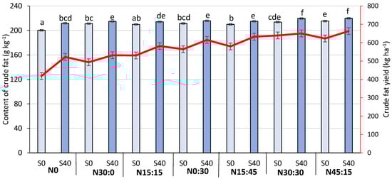 Effects of nitrogen × sulphur application on the content of crude fat in soybean seeds and fat yield. Means marked with the same letter do not differ significantly at p = 0.05, bars mean SE, red line–protein yield. S0—without sulfur, S40—40 kg S ha−1, N0–without nitrogen, N30:0—30 kg N ha−1 before sowing, N15:15—15 kg N ha−1 before sowing + 15 kg N ha−1 at the start of the seed filling, N:0:30—30 kg N ha−1 at the start of the seed filling, N15:45—15 kg N ha−1 before sowing + 30 kg N ha−1 at the start of the seed filling, N30:30–30 kg N ha−1 before sowing + 30 kg N ha−1 at the start of the seed filling, N45:15—45 kg N ha−1 before sowing + 15 kg N ha−1 at the start of the seed filling.