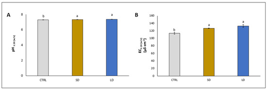 The addition of SD and LD significantly increased both the soil pH (+2.3% and +2.7%, respectively) and EC (+11.6% and 17.1%, respectively), compared to the relative controls (Figure 1A and B, respectively).