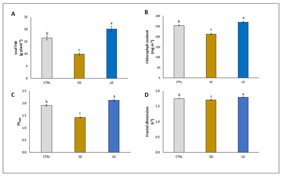 Among the biometric and photosynthetic parameters analyzed in the lettuce leaves, a similar trend was observed with the addition of SD and LD. Specifically, the SD significantly decreased the leaf fresh weight (−39.5%), chlorophyll content (−16.5%), PIABS (−25.1%), and fractal dimension (−2.3%), compared to their corresponding controls (Figure 2A, B, C, and D, respectively). On the contrary, LD significantly increased the leaf fresh weight (+22.9%), chlorophyll content (+6.2%), PIABS (+11.0%), and fractal dimension (+2.3%), compared to their corresponding controls (Figure 2A, B, C, and D, respectively).