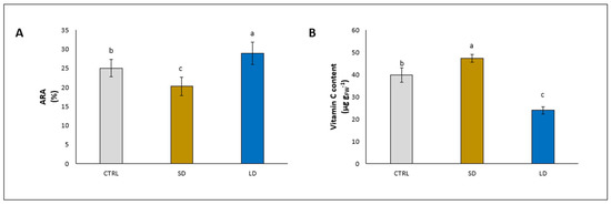 At the leaf level, it was evident that the antioxidant system was reduced (ARA: −29.3%) by the addition of SD, while it was increased (ARA: +28.6%) by the addition of LD, compared to the control (Figure 3A). Surprisingly, the determination of the content of vitamin C showed both a strong increase by +18.8% and a decrease by −39.8% with the addition of SD and LD, respectively, compared to the control (Figure 3B).