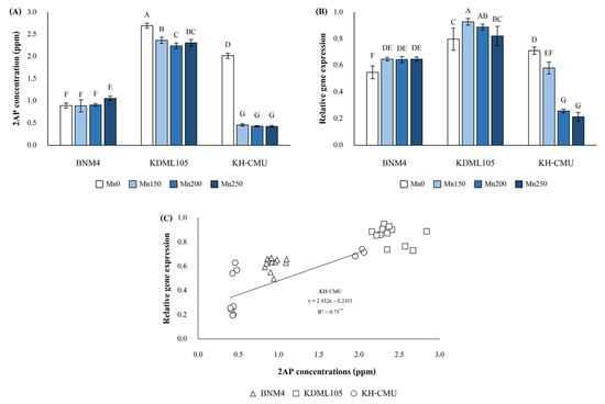 Effects of different manganese concentrations on the grain 2AP concentration (A), relative gene expression (B) and correlation between the 2AP concentration and relative gene expression (C) of different Thai fragrant rice varieties. Each column represents the mean of three data points ± standard errors (n = 3). Means sharing a common letter do not differ significantly at p < 0.05. ** Significantly different at p < 0.01.