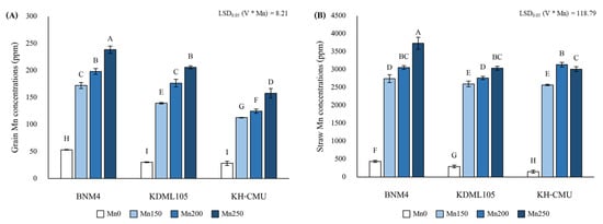 The influence of the Mn treatments on grain and straw was significant (Figure 3). Applying Mn150, Mn200 and Mn250 increased grain Mn concentrations by 222.8–347.5% in BNM4, 361.9–581.6% in KDML105 and 297.9–460.6% in KH-CMU as compared with Mn0. The highest grain Mn concentration was observed in all fragrant rice varieties when Mn250 was applied (Figure 3A). The Mn concentration in straw increased with an increase in the Mn rate, by 531.6–758.6% in BNM4, 790.1–940.5% in KDML105 and 1639.2–1940.31% in KH-CMU as compared with Mn0 in all the rice varieties (Figure 3B). The highest straw Mn concentration was observed in BNM4 and KDML105 under the Mn250 treatment; the concentration in KH-CMU under Mn200 was higher than that under Mn250.