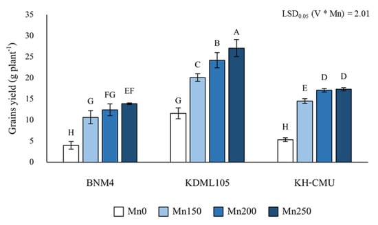 Effects of different manganese concentrations on the grain yield of different Thai fragrant rice varieties. Each column represents the mean of three data points ± standard errors (n = 3). Means sharing a common letter do not differ significantly at p < 0.05.