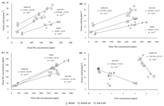 Grain yield was significantly positively correlated with grain Mn concentration in BNM4 (r = 0.96, p < 0.001), KDML105 (r = 0.98, p < 0.001) and KH-CMU (r = 0.97, p < 0.001) (Figure 5A). Grain yield was also positively correlated with straw Mn concentration in BNM4 (r = 0.97, p < 0.001), KDML105 (r = 0.93, p < 0.001) and KH-CMU (r = 0.99, p < 0.001) (Figure 5B). There was a positive correlation between grain and straw Mn concentration in BNM4 (r = 0.99, p < 0.001), KDML105 (r = 0.97, p < 0.001) and KH-CMU (r = 0.95, p < 0.001) (Figure 5C). However, 2AP concentration showed a negative correlation with grain yield in KDML105 (r = −0.95, p < 0.001) and KH-CMU (r = −0.69, p < 0.01) (Figure 5D).