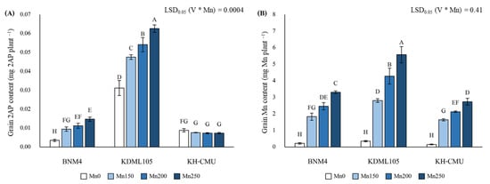 In this experiment, the 2AP concentration decreased with increased grain yield caused by the increase in Mn application. Therefore, the 2AP content, i.e., the 2AP yield, was determined, as well as the grain Mn content. The interaction between the different rice varieties and Mn treatments had effects on grain 2AP content (Figure 6A). The highest 2AP content was observed in KDML105. The 2AP content increased significantly with increasing Mn rates in two varieties when compared with Mn0; there was an increase of 268.6–420.0% in BNM4 and 152.2–200.6% in KDML105 under Mn150–Mn250. However, the 2AP content in KH-CMU did not differ when compared to Mn0.
