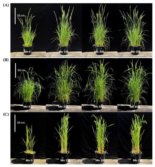 Rice plants at the flowering stage of three fragrant rice varieties (BNM4 (A), KDML105 (B) and KH-CMU (C)) grown under four manganese concentrations. Photographs were taken 69, 80 and 57 days after germination of BNM4, KDML105 and KH-CMU, respectively.