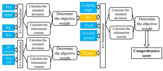 The raw data of seed yield, growth period, lodging angle, plant height, relative branch height, branch length, branch angle, oil content, and oleic acid content of each tested rapeseed variety were used to evaluate the comprehensive performance. Firstly, these indices were mapped to 0–1 intervals to eliminate the impact of dimension by 0–1 normalization. For the positive indices (seed yield, relative branch height, oil content, and oleic acid content), the 0–1 normalized calculation formula is ; for the remaining negative indices, the corresponding formula is , wherein i and k represent the i-th variety and k-th index, respectively. Secondly, the D-CRITIC (Distance-based inter-criteria correlation) method was used to calculate the objective weight of each index [23], which incorporated the distance correlation and standard deviation of each index to produce more valid criteria weights. The contained information of the k-th index () was calculated as follows: , wherein is the standard deviation of each criterion, and is the distance correlation coefficient between the k-th and j-th indices. Then, the objective weight was calculated as the formula: . In the final stage, the criteria weights and index values of each variety were aggregated into a comprehensive score by the membership function method, as follows: , wherein is the comprehensive score of i-th variety. Based on these comprehensive scores, the rapeseed varieties could be ranked from the most to the least preferred ones for decision making. The diagram graph for calculating the comprehensive score is provided in Figure 1.