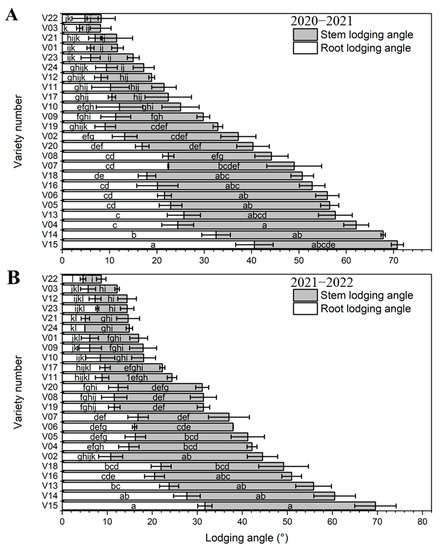 Root and stem lodging angles of the 24 rapeseed varieties for the growing seasons 2020–2021 (A) and 2021–2022 (B). Different lowercase letters in the bar indicate significant difference at the 5% level.