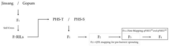 A PHS tolerance line (PHS-T) and a PHS susceptible line (PHS-S) were selected from a RIL population generated through crossing ‘Jinsang’, a parent producing high-quality rice, with ‘Gopum’, which also produces high-quality rice but is susceptible to PHS [30,31]. In the RIL population, parent plants were selected with similar agricultural traits, except for the PHS trait; as a result, the F2 and F3 populations showed pronounced segregation of tolerance and susceptibility, whereas traits such as plant height, heading date, culm length, and panicle length were uniform. In the previous study, 88 F2 from a cross between PHS-T and PHS-S were used for QTL analysis to identify candidate regions [32]. The heterozygous plant was selected from the F2 population to generate F3 plants for further fine-mapping (Figure 1). PHS-T, PHS-S, and 241 F3 plants were grown in the experimental field at Pusan National University in 2018 and 2020.