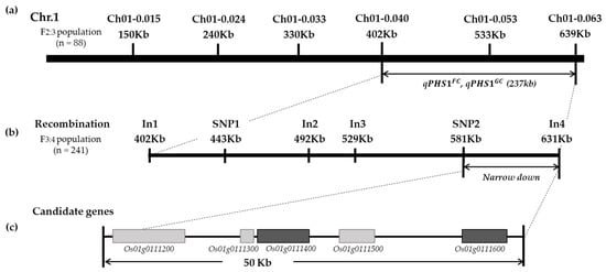 Fine-mapping of qPHS1FC and qPHS1GC. (a) Physical map of the qPHS1FC and qPHS1GC locus using F2:3 plants. (b) High-resolution mapping of the qPHS1FC and qPHS1GC locus using F3:4 plants. (c) Candidate genes of qPHS1FC and qPHS1GC. Black blocks indicate candidate genes with SNPs or InDel polymorphisms.