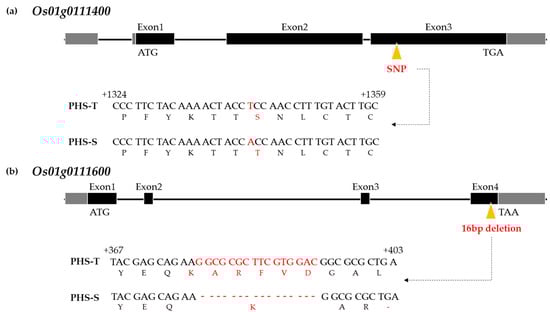 Among five candidate genes of qPHS1FC and qPHS1GC, three candidate genes, Os01g0111200, Os01g0111300, and Os01g0111500, were monomorphic between PHS-S and PHS-T (Table 1). Therefore, the remaining two genes (Os01g0111400 and Os01g0111600) were cloned and sequenced to detect the respective regions. Os01g0111400 had one SNP between the parents. One SNP in Os01g0111400 was detected in the third exon; the SNP was a T and an A in the PHS-T and PHS-S lines, respectively, and caused an amino acid change from serine to threonine (Figure 3a and Table 1). Os01g0111600 showed a 16 bp deletion region in the fourth exon of PHS-S, giving rise to a stop codon-type of amino acid (Table 1 and Figure 3b).