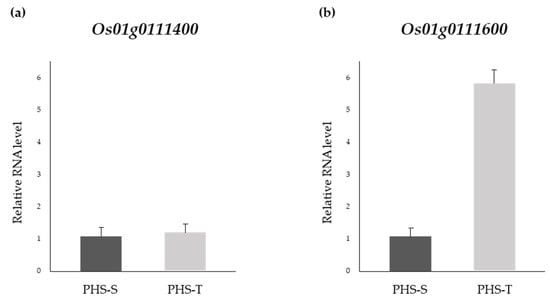 Expression analysis was performed to investigate the transcript type of Os01g0111400 and Os01g0111600 in PHS-S and PHS-T during the grain-filling stage. For expression analysis, primers of target genes (Os01g0111400 and Os01g0111600) were designed for qRT-PCR (Table S3). The relative expression level of Os01g0111400 was similar between the two parents (Figure 4a), whereas the relative expression of Os01g0111600 was markedly higher in PHS-T than in PHS-S, and the 16 bp deletion type exhibited reduced expression (Figure 4b). These results suggest that Os01g0111600 acts as a positive regulator of PHS during seed germination rather than Os01g0111400, and the deletion region leads to PHS sensitivity.