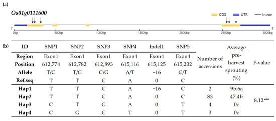 Haplotype analysis of Os01g0111600. (a) Schematic representation of the gene structure and SNP positions in Os01g0111600. (b) Results of haplotype analysis of Os01g0111600. Yellow and blue blocks and gray lines indicate exons, untranslated regions, and intron regions, respectively. Black vertical bars represent SNPs and InDel regions. Hap: haplotype. Letters a, b, and c represent significant differences at *** p < 0.001 (Duncan’s test).