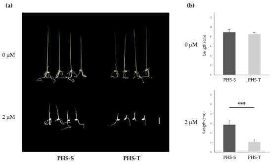 The response of PHS-S and PHS-T to ABA treatment during seed germination and post-germination stages. (a) Performance of PHS-T and PHS-S under untreated and 2 µM ABA treatment. Scale bars: 1 cm. (b) Shoot length of PHS-T and PHS-S under untreated and 2 µM ABA treatment. Error bars indicate standard deviations, n ≥ 10, *** p < 0.001 (Duncan’s test).