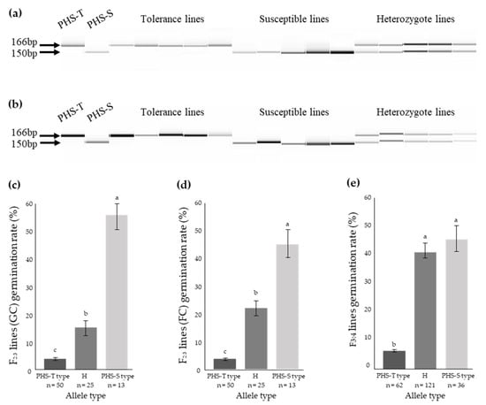Co-segregation analysis of the Os01g0111600-16bp InDel marker using a fragment analyzer in F2:3 and F3:4 populations. Tolerance type: 166 bp; susceptible type: 150 bp. (a) Co-segregation analysis of the OS01g0111600-16bp InDel marker in the F2:3 population. (b) Co-segregation analysis of the OS01g0111600-16bp InDel marker in the F3:4 population. (c) Pre-harvest sprouting rate of the PHS-T type in the F2:3 populations under growth chamber conditions. (d) Pre-harvest sprouting rate of the PHS-T type in the F2:3 populations under field conditions. (e) Pre-harvest sprouting rate of the PHS-T type in the F3:4 populations under growth chamber conditions. PHS-T type, H, PHS-T type, and n indicate the reference type, heterozygote, 16bp deletion type, and number, respectively. GC and FC represent growth chamber and field conditions, respectively. Letters a, b, and c represent significant differences at p < 0.001 (Duncan’s test).