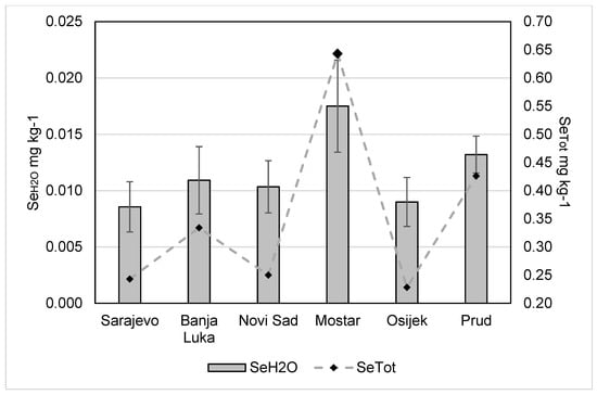 Concentrations of SeTot and SeH2O are shown in Table 1. The % SeH2O of the SeTot by location was fairly consistent: Sarajevo, 3.5%; Banja Luka, 3.26%; Novi Sad, 4.12%; Mostar, 2.72%; Osijek, 3.9%; and Prud, 3.1% (mean 3.1%, n = 52). SeTot and SeH2O were linearly related across all soils, and the highest amounts of both were found around Mostar (SeTot = 0.643 mg kg−1 and SeH2O = 0.0175 mg kg−1). In contrast, the lowest observed levels of SeTot were in the vicinity of Osijek (0.22808 mg kg−1), and low SeH2O levels were found around Sarajevo (0.00856 mg kg−1) and Osijek (0.0089 mg kg−1). The concentration of SeTot for the rest of the locations are as follows, from higher to lower: Prud > Banja Luka > Novi Sad as well as SeH2O.