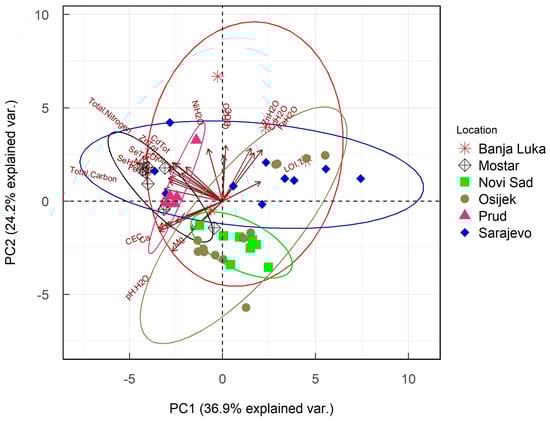 Table 1 shows means and standard deviations of chemical properties of samples from all studied areas. The soil organic matter (SOM/LOI) content was highest in Mostar soils (9.7%), while the content at other sites ranged from 5.2% to 6.8%. The mean value of pH (H2O) for all locations was slightly alkaline, 7.18. The Mostar area had the highest value of total carbon (4.7%) and total nitrogen (0.36%). The highest total carbon (TC) values were accompanied by the highest values of LOI. Dissolved organic carbon (DOC) varied by location, from the lowest value in Prud (156 mg kg−1) to the highest observed value in Banja Luka (352 mg kg−1). The mean value for the LOI/TC (total carbon) ratio across all locations was 2.66. The CEC varied considerably by location, with the highest values around Mostar (101,607 cmolc kg−1), and the minimum values observed in Banja Luka sites (30,336 cmolc kg−1). Table 1 also shows the total concentrations in water extraction (CrH2O, FeH2O, NiH2O, SeH2O, CdH2O, and ZnH2O) as well as in ultra-pure HNO3 (CrTot, FeTot, NiTot, ZnTot, SeTot, CdTot). Sarajevo, Banja Luka, Mostar, and Prud had CrTot concentrations above the concentrations prescribed by the WHO (WHO 1996). All sample sites had a higher concentration of NiTot than the recommended safe level, which is 35 mg kg−1, except the Osijek area [52]. The ZnTot concentrations in all studied locations were lower than the recommended (50 mg kg−1) values in soil [52]. In the area of all sample sites, it was found that CdTot kg−1 amounts were below the maximum permissible concentrations (MPC—0.8 mg kg−1) [52]. Samples from the Mostar area showed concentrations of SeTot (0.5 mg kg−1) above deficiency levels [26], while SeTot deficiency was determined at all other sampling locations. The calculated SeO42 concentrations (n = 52) varied, along with the SeTot and SeH2O, being the highest in soils from Mostar and lowest in soils from Sarajevo and Osijek: Mostar > Prud > Banja Luka = Novi Sad > Sarajevo = Osijek.
