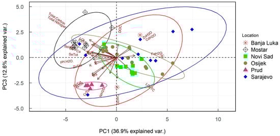 Generally, soils from Banja Luka, Sarajevo, and Osijek showed considerable variability in their properties, which can be seen from Figure 1 and Figure 2, where ellipses are scattered across all quadrants. In Figure 3, soils from Prud, Novi Sad, and Mostar are more strongly grouped. Samples from Novi Sad also grouped near the origin of PC1, while soils from Prud and Mostar were mostly on the positive side of PC2. Soils from the Osijek sampling location formed two distinct clusters in PC2, with contrasting properties correlated to this component, while the samples from Banja Luka and Sarajevo showed high diversity and appeared scattered across the assessed PCs. Prud, Mostar, and Novi Sad maintained distinctness and tight grouping in PC3 (Figure 4), similar to PC2. Between PC1 and PC3, distinct clusters of samples from Osijek were not visible, while the samples from Banja Luka and Sarajevo showed similar scattering patterns as in PC2. In all three biplots, samples in the top-left quadrant showed the highest SeTot values. However, it can be seen in Figure 2 that the samples from this quadrant are also accompanied by the higher values of total Ni, Cd, Fe, and Zn. In both biplots, it was shown that only soils from the Mostar region were consistently grouped in quadrants correlated with parameters assessing Se, while soils from other regions showed a grouping influenced by other soil properties.