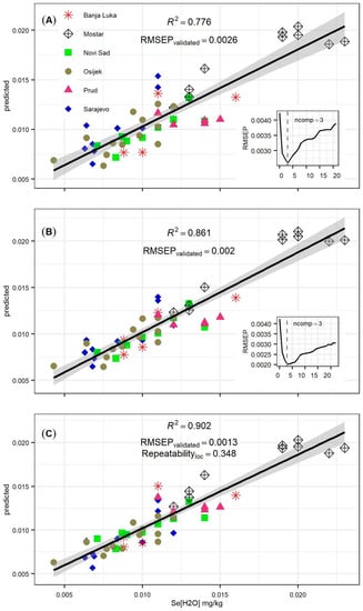 Based on the complex relationships between SeH2O and the other analyzed soil properties and element concentrations (Figure 1), along with the substantial variability among analyzed soils (Figure 3 and Figure 4), three predictive models for SeH2O were fitted and calibrated. The first PLS model included all analyzed quantitative properties except SeTot (Figure 5A), while the second also included SeTot (Figure 5B). The third model included latent variables from model 2 (Figure 5B) along with a random location effect in a mixed model (Figure 5C). Uncalibrated models 1 and 2 explained 89.78% and 93.82%, respectively, of the variance in SeH2O (not shown), while the calibrated models explained 77.60%, 86.06%, and 90.20% (Figure 5). As expected, the model without SeTot (Figure 5A) had a higher error of prediction, compared to the model with it (Figure 5B). The error of prediction was the lowest in the model 3, including the location random effect (Figure 5C).