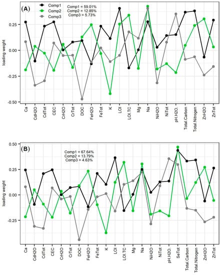 To assess the grouping of soils according to the analyzed properties, PC analysis was carried out. The first three principal components explained 73.6% of the variation in the data set, with 61.1% in the first two components (36.9% by PC1 and 24.2% by PC2, Figure 2). An inspection of the biplot (for communalities see Supplementary Table S1) showed that PC1 was mainly correlated with LOI/TC in the positive direction and TC, CEC, Ca, Mg, Na, and K in the negative direction. PC2 was in a positive correlation with DOC and the water extracts of heavy metals, and in a negative correlation with pH and Mg (Figure 3).