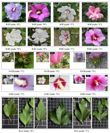 The description and codes for five qualitative traits of Hibiscus syriacus flower and leaf parts, for which the yellow arrow indicates the typical characteristic. Whether the stamens are heterogeneous in terms of inner petals (B-IP): (a-1,a-2) stamens not differentiated into inner petals (No, 0); (b-1,b-2) stamens differentiated into inner petals (Yes, 0). Whether the petals have the red center (B-RC): (c-1,c-2) petals without the red center (No, 0); (d-1,d-2) petals with the red center (Yes, 0). Relationship of the calyx with the bract (O-CB): (e-1) calyx shorter than bract (Shorter, 1); (e-2) calyx almost equal to bract (Near equal length, 2); (e-3) calyx longer than bract (Beyond, 3). Relationship of the red center line with the red center (O-RC): (f-1) red center line is almost equal to red center (Near equal length, 1); (f-2) red center line is longer than red center (Beyond, 2); (f-3) red center line is significantly longer than red center (Beyond obviously, 3). Whether leaf lobing is strong (B-LL): (g-1,g-2,g-3) low degree of leaf lobing (No, 0); (g-4,g-5,g-6) high degree of leaf lobing (Yes, 1).