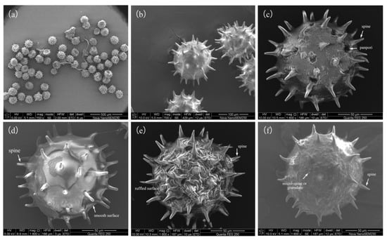 Hibiscus syriacus pollen grains electromicrographed by SEM. (a,b) An overall full view of pollen grains as spheroidal monads with spines. (c) The germinal porus (panpori) on the pollen surface. (d) A pollen grain with a smooth surface (pollen surface ornamentation is inconspicuous). (e) A pollen grain with a ruffled surface (pollen surface with distinctive cerebroid ornamentation). (f) A pollen grain with micro-spines or granulate on its surface.