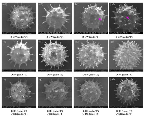 The description and codes for four qualitative traits of Hibiscus syriacus pollen grains, where the red arrow indicates the typical characteristic. Whether the pollen surface has granular verrucae (B-GW): (a-1,a-2) pollen exine is smooth or ruffled without micro-spines or granular verrucae (No, 0); (b-1,b-2) pollen exine has micro-spines or granular verrucae (Yes, 0). Number of pollen surface spines (O-SA): (c) pollen surface spines less than forty in number (<40, 1); (d-1,d-2) pollen surface spines varying between forty and fifty (40~50, 2); (e) pollen surface spines greater than or equal to fifty in number (≥50, 3). Whether the pollen surface ruffles strongly (B-RS): (f,g) pollen surface not strongly ruffled, smooth, or slightly ruffled (pollen surface ornamentation is inconspicuous or with a small number of ornaments) (No, 0); (h-1,h-2) pollen surface strongly ruffled (pollen surface with distinctive ornamentation) (Yes, 1). Degree of pollen surface ruffling (O-DR): (f) pollen surface smooth and free of ruffles (pollen surface ornamentation is inconspicuous) (smooth and largely unruffled, 1); (g) pollen surface is slightly ruffled (pollen surface with a small number of ornaments) (light ruffles, 2); (h-1,h-2) pollen surface strongly ruffled with striate or a mixture of striate and cerebroid (pollen surface with distinctive ornamentation) (strong ruffles, 3).