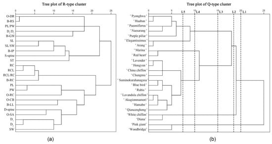 Tree plot of R-type cluster and Q-type cluster of Hibiscus syriacus. (a) R-type conducted on 24 combined morphological traits based on between-groups linkage method. (b) Q-type conducted on Hibiscus syriacus 24 cultivars based on ward method.