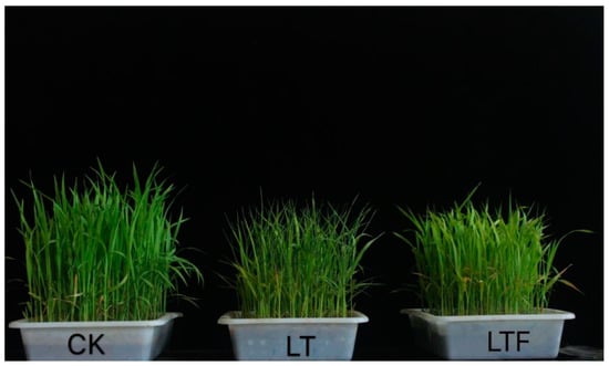 Enzymatic activities were measured on the third day of LT and LTF treatments. For each treatment group, three pots of plants were selected and 3 g of leaf samples were taken, placed in tin foil and immediately put into liquid N2 and then stored at −80 °C until extraction. Peroxidase (POD) activity, superoxide dismutase (SOD) activity, catalase (CAT) activity and soluble protein content were determined using solution configuration [,,].