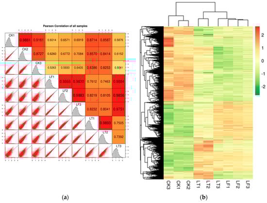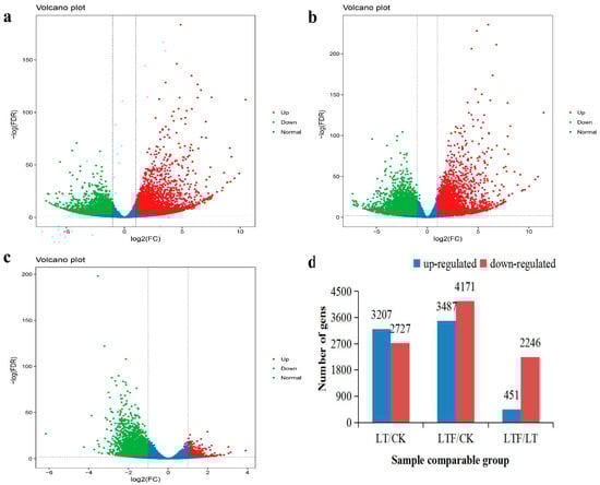 In this study, the reliability of the transcriptome data was assessed using the Pearson’s correlation coefficient, that is, the closer the r is to 1, the stronger the correlation between the two replicate samples; the good reproducibility of all three biological replicates in each treatment was obtained from the correlation coefficient (Figure 2a). In addition, we visualized the expression patterns of different points in each group through cluster analysis, which further showed that the data were reliable (Figure 2b). To compare the differences on gene expression under LT and LTF, we divided the different treatments into three groups. In total, 5934 DEGs were identified from the rice leaves between the LT and CK (3207 up-regulated and 2727 down-regulated) (Figure 3a,d); 7658 DEGs were identified between the LTF and CK (3487 up-regulated and 4171 down-regulated) (Figure 3b,d); and 2697 DEGs were identified between the LTF and LT (451 up-regulated and 2246 down-regulated) (Figure 3c,d).