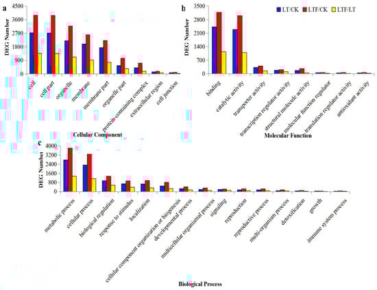 The main biological functions of DEGs in rice seedlings under LT and LTF stress were further to be studied using gene ontology (GO) enrichment analysis. All DEGs can mainly contain three categories such as biological process (BP), molecular function (MF) and cellular component (CC). GO enrichment analysis showed that the DEGs were involved in nine subcategories of CC (Figure 4a), eight subcategories of MF (Figure 4b) and fifteen subcategories of BP (Figure 4c) between LT, LTF and CK. In cellular components, the three most enriched subcategories were ‘cell’, ‘cell part’ and ‘organelle’. The ‘binding’ was the most enriched subcategory in the molecular function. In biological process, the ‘metabolic process’ was the most enriched subcategory.