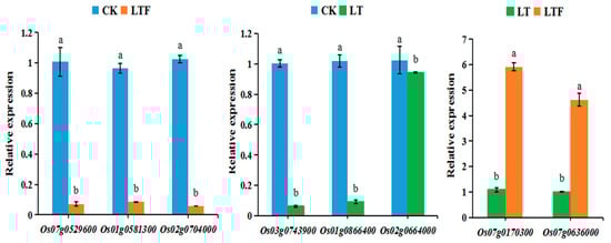 Total RNA from three tissue samples was isolated using an RNA Extraction Kit (Tiangen Biotech, Beijing, China). The cDNA was prepared using the PrimeScript RT reagent kit with gDNA Eraser (TaKaRa, Kyoto, Japan). The qRT-PCR primers were designed using Primer 5.0 (Table S2). A total of eight genes in the LT/CK, LTF/CK and LTF/LT comparison groups were selected for qRT-PCR analysis with specific primers. qRT-PCR detailed implementation steps refer to previous literature []. Three biological and technical replicates were conducted separately to ensure data reliability.
